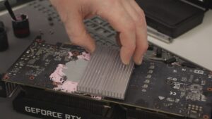 Avant d’entrer dans les solutions bizarres, on peut toujours ajouter un ventilateur sur la tranche de votre carte graphique, ce qui permet de passer la température du GPU à 61°C et de réduire le hotspot à 78°C, déjà une sacrée baisse, le tout, sans démontage. Sinon, l’ajout d’un petit dissipateur sur la backplate d’origine de ce modèle n’aura pas apporté grand chose par rapport à la carte stock : 1°C de moins sur le GPU et 2°C de moins sur le hotspot.