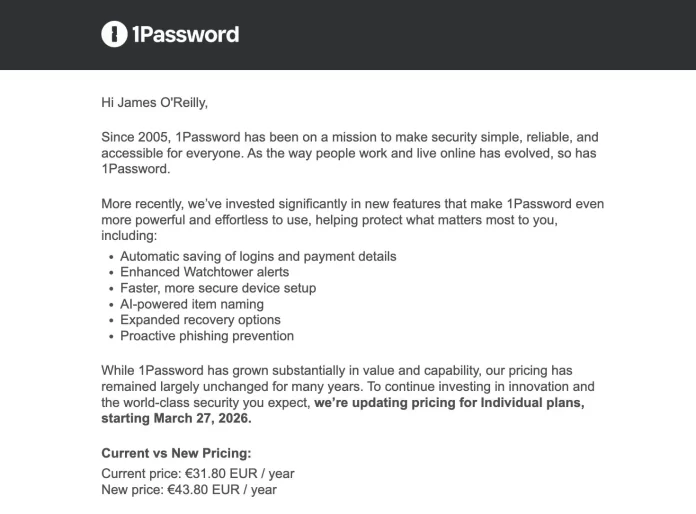 Tout augmente, y compris… les gestionnaires de mots de passe. Le utilisateurs de 1Password ont eu la mauvaise surprise de découvrir par courriel qu’ils allaient payer plus cher leur abonnement annuel. Dans le détail, la formule Individuel pour un an leur sera facturée 43,80 € au lieu de 31,80 €. L’abonnement Familles, qui coûtait jusqu’à présent 57 €, reviendra désormais 69 €. Soit 38 % dans le premier cas (ouch !) et 21 % dans le deuxième.