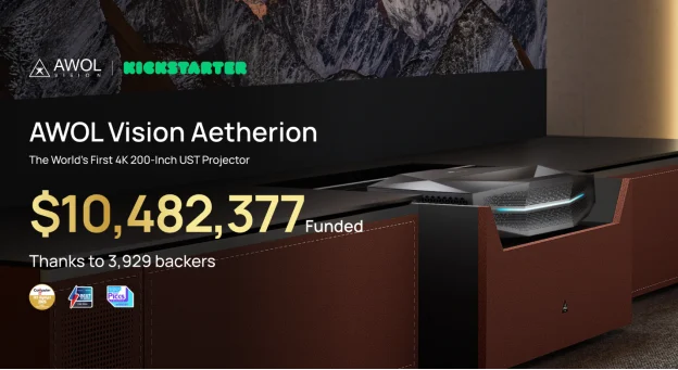 Le fabricant AWOL Vision signe le démarrage le plus important sur la plateforme de financement participatif Kickstarter. Son vidéoprojecteur triple laser 4K Aetherion a franchi la barre symbolique des 10 millions de dollars de financement en 12 heures.