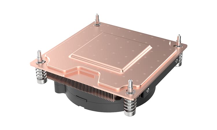 Comme on peut le voir, il adopte une construction en cuivre avec des ailettes directement usinées dans la masse. Au niveau de la base, comme nous vous le disions, nous retrouvons une chambre à vapeur dont le but est de maximiser les performances thermiques. Malgré tout, il conservera une capacité de refroidissement limitée : 125W. Mais peut-on en demander davantage à un dissipateur aussi compact ?
