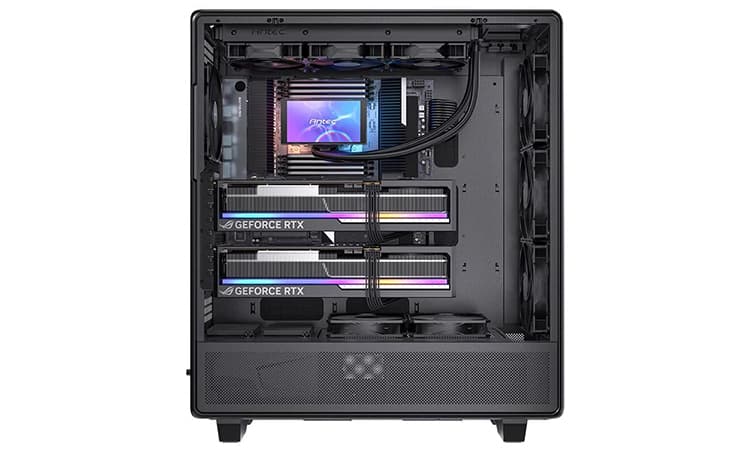 Avec ce nouveau boîtier, Antec annonce une référence au format grand tour se traduisant par des dimensions de 250 (L) x 547 (P) x 622 (H) mm. Sur la balance, c’est également un gros bébé puisqu’il pèse pas moins de 15 kg. Attention à ne pas vous bloquer le dos, surtout une fois la configuration assemblée à l’intérieur.