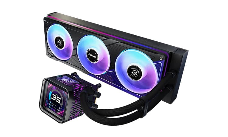 Concrètement, ASRock nous propose des kits dont le design entre en adéquation avec toutes ses séries de produit. Forcément, le plus haut de gamme sera le kit Taichi Aqua 360 Oled. Pour cet AIO, nous retrouvons une pompe intégrée dans un radiateur de 360 mm pour 38 mm d’épaisseur. La ventilation repose sur un trio de moulins en 120 mm dont la construction repose sur du LCP (Liquid Crystal Polymer) tandis que la pompe intègre, au choix, un écran ou pas. Si vous le souhaitez, vous pourrez le retirer pour admirer le liquide couler dans le waterblock.