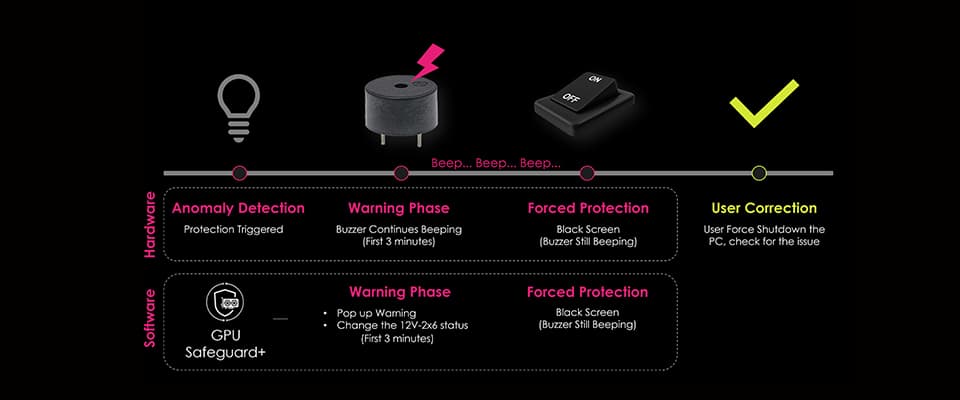La différence en le GPU SafeGuard et GPU SafeGuard+ concerne la présence d’un pop-up qui apparaîtra dans votre logiciel MSI Center pour vous avertir d’un problème en plus du bip sonore. Effectivement, la version + de la fonctionnalité est implémentée dans les blocs MPG, plus haut de gamme, qui profitent d’un monitoring via le logiciel de la marque, ce qui