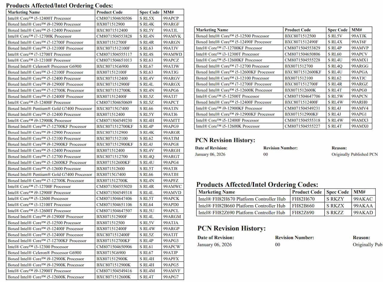 Concrètement, plus d’une cinquantaine de processeurs Alder Lake se retrouvent placés sous le statut EOL (End of Life) par les bleus. Cela concerne donc des Core i9/i7/i5/i3 et même des Pentium et des Celeron, le tout en version tray ou en boîte. Ainsi, même les populaires Core i5 12600K ou Core i7 12700K ne seront progressivement plus renouvelés. Cependant, il y a encore de quoi voir venir puisque les dernières commandes devront être placées avant le 10 avril 2026. Ensuite, à partir du 24 juillet 2026, les commandes ne pourront plus être annulées ni retournées tandis que les dernières expéditions auront lieu le 22 janvier 2027.