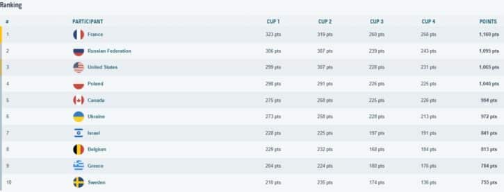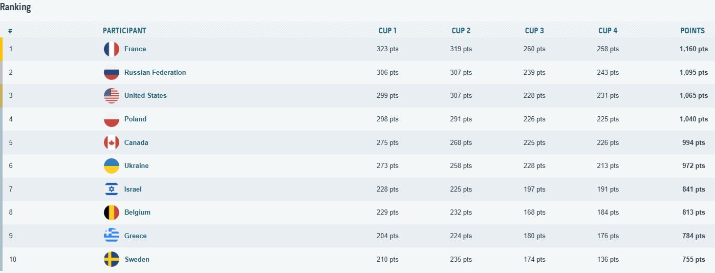 Comme vous pouvez le voir, cette victoire est obtenu en plus avec une avance confortable. Les connaisseurs ou habitués noteront l’absence des australiens du classement, eux qui ont pourtant été victorieux plusieurs fois dans cette compétition.