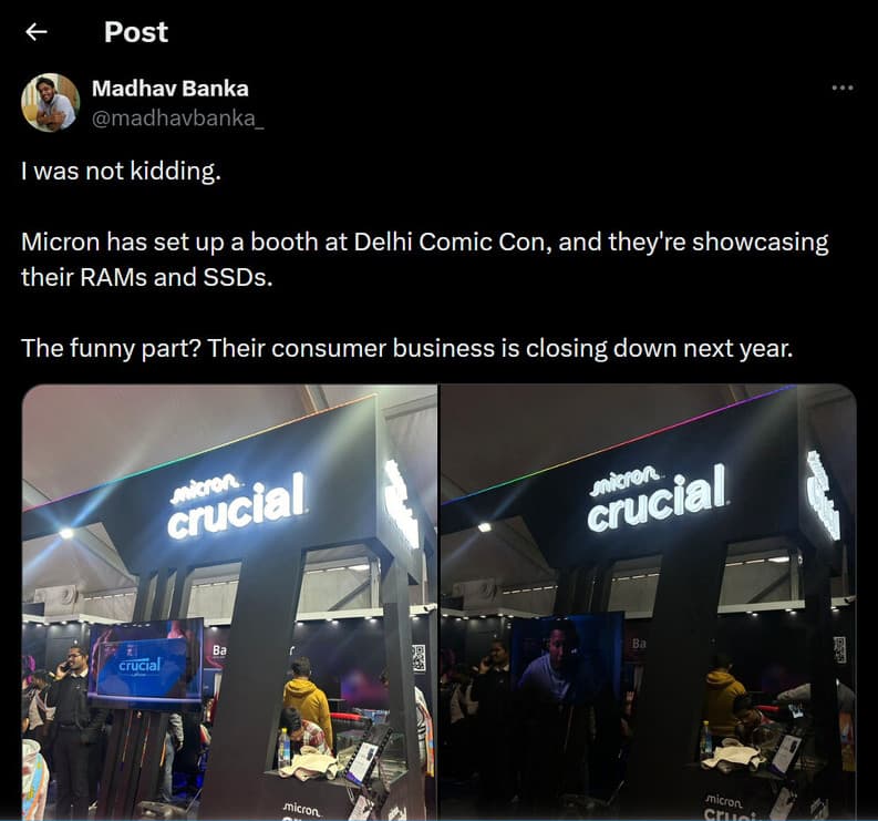 La semaine dernière, nous apprenions que Crucial fermerait ses portes début 2026. En effet, Micron veut mettre un terme avec son business grand public, puisque jugé, pas assez rentable. Attention, nous ne sommes pas en train de dire que la marque était déficitaire, mais que les bénéfices ne sont pas assez élevés aux goûts de la maison mère. En 2025, l’IA, c’est « the place to be » comme, dirait l’autre. En attendant, la marque était enregistrée comme exposant dans des événements avant que la décision ne soit rendue publique. Comme le Comic Con en Inde !