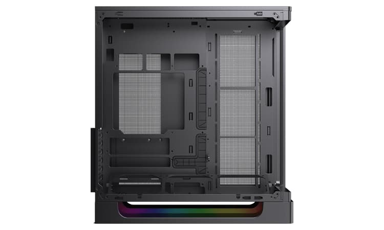 En matière de ventilation, le boîtier propose huit emplacements pour des ventilateurs de 120 mm. Effectivement, nous en retrouvons trois sur le côté de la carte mère et trois dans le bas, montés sur un support inclinable de 10 à 20°. Quant aux deux derniers, ils prendront place à l’arrière. Cependant, dans le haut, il n’y a pas de support de ventilateur.
