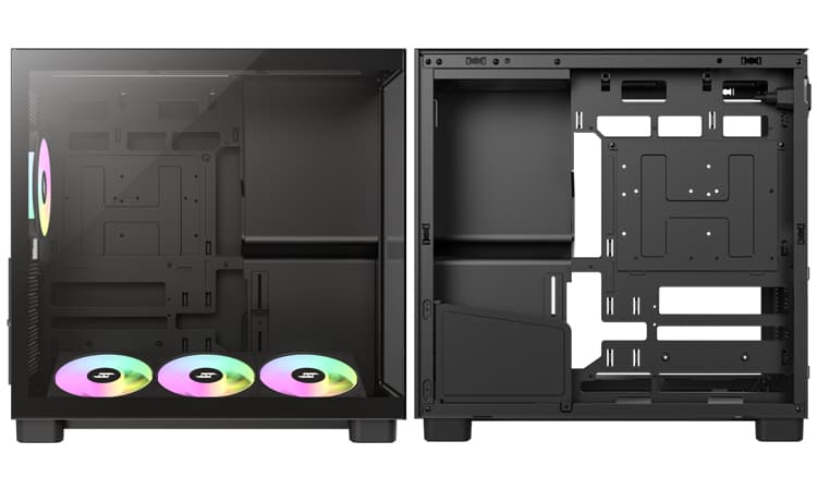 À l’intérieur, GameMax adopte pour un agencement similaire à celui du Model 5 de Geometric Future. Ainsi, nous avons une carte mère montée à la verticale tandis que l’alimentation s’installe dans un cache juste à côté. Enfin, la ventilation adopte un schéma type cheminé avec des moulins installés dans le bas en aspiration. En revanche, ces derniers sont montés sur une platine inclinable.