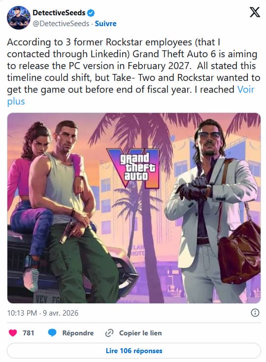 Sur X, l’insider Detective Seeds a indiqué avoir joint plusieurs anciens employés de Rockstar Games. Trois d’entre eux lui ont confirmé que Grand Theft Auto 6 viserait une sortie PC en février 2027, soit seulement trois mois après le lancement sur consoles. Mais les commentaires ne sont pas tendres avec Detective Seeds. Une partie de la communauté reste sceptique. Ils sont globalement nombreux à estimer qu’un écart aussi réduit risquerait de cannibaliser les ventes PS5 et Xbox Series X/S…Mais le raisonnement inverse peut s’appliquer. La