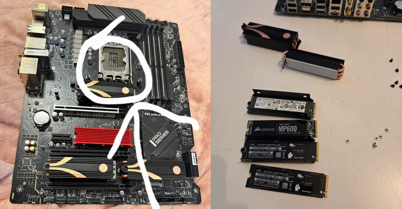 Bref, ils se mettent d’accord pour une rencontre, notre utilisateur achète la carte et rentre chez lui. Après démontage, c’est la bonne surprise puisque les dissipateurs cachaient en réalité deux SSD Western Digital SN850X de 4 To chacun, un Intel 670P de 2 To et un Corsair MP600 de 2 To. Cependant, dans le cas du Corsair, Core ou Elite, la variante n’est pas connue.