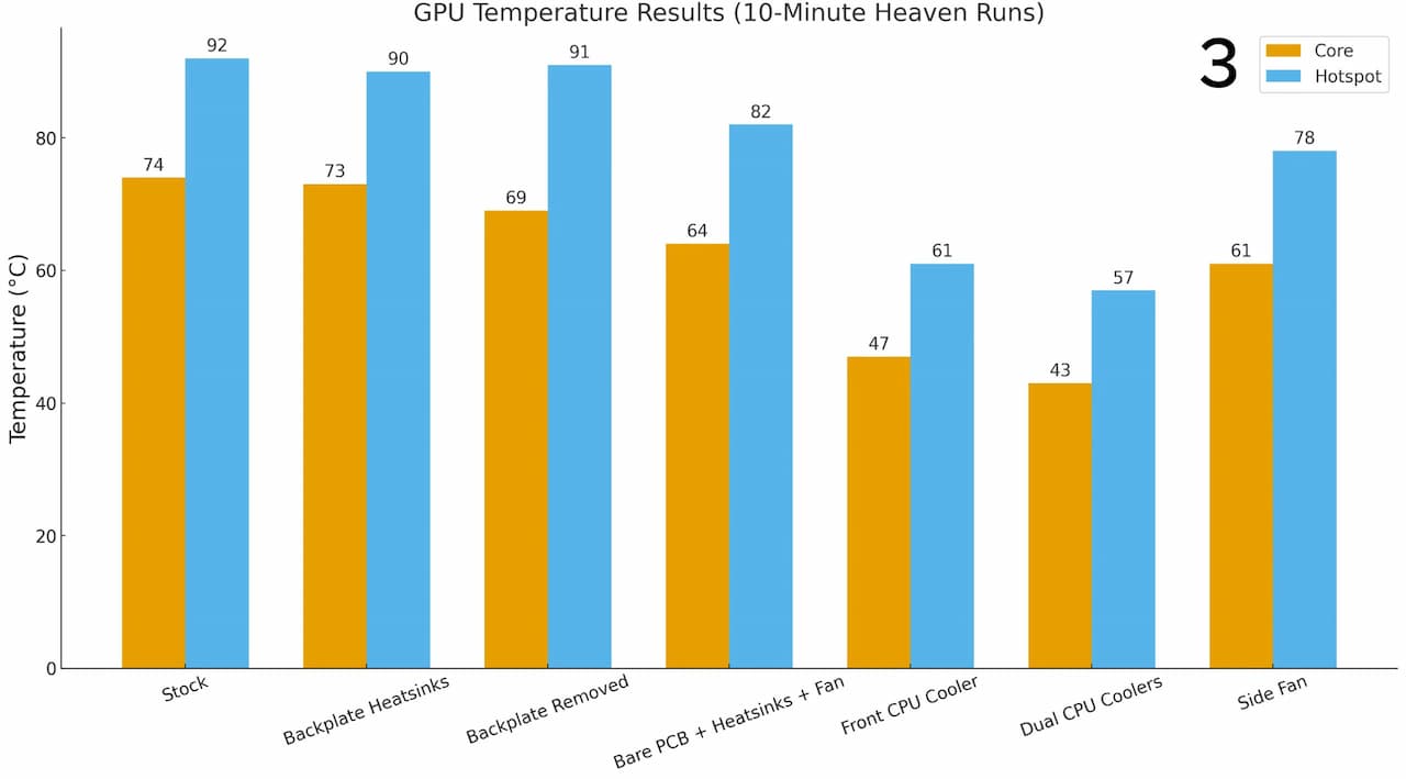 Avant d’entrer dans les solutions bizarres, on peut toujours ajouter un ventilateur sur la tranche de votre carte graphique, ce qui permet de passer la température du GPU à 61°C et de réduire le hotspot à 78°C, déjà une sacrée baisse, le tout, sans démontage. Sinon, l’ajout d’un petit dissipateur sur la backplate d’origine de ce modèle n’aura pas apporté grand chose par rapport à la carte stock : 1°C de moins sur le GPU et 2°C de moins sur le hotspot.