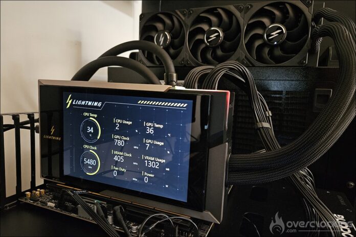 Dans les grandes lignes, avec cette carte, MSI nous promet un modèle ultra haut de gamme produit en série limitée. La carte met donc en avant une solution de refroidissement liquide tout-en-un en 360 mm. Sur le devant de la carte, nous retrouvons un écran qui couvre une grosse partie de la surface de la carte. Via ce dernier, vous pouvez surveiller différentes informations liées à cette dernière. Cela peut être utile tant que vous pratiquez l’overclocking avec le dissipateur par défaut monté dessus. Sinon, sous azote liquide ou via un watercooling custom, l’intérêt est plus limité, il faut l’avouer.