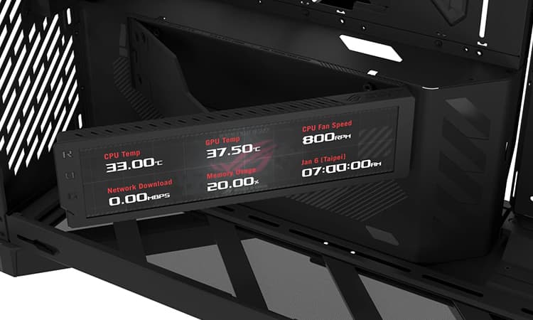 Bien sûr, l’attraction principale de ce modèle réside dans son écran intégré qui prend place sous l’emplacement de la carte graphique. Ce dernier profite d’une diagonale de 9,2″ tout en affichant une définition de 1920×462 pixel. Il propose une luminosité de 400 nuits et une fréquence de 60 Hz.
