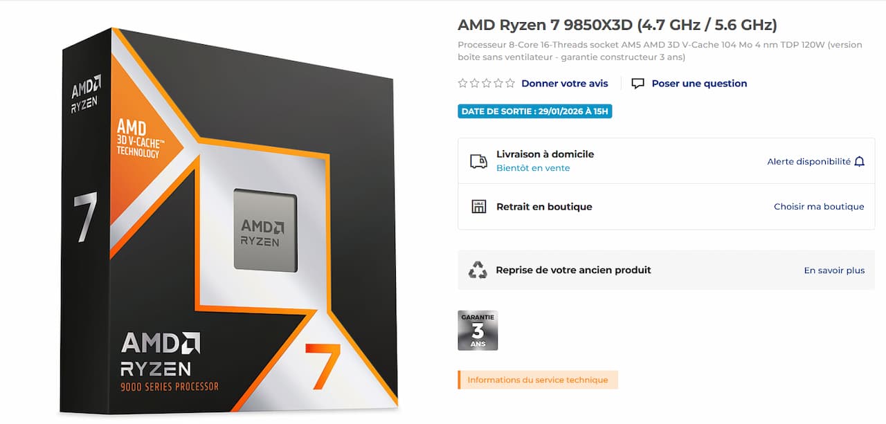 Petit tour du côté des processeurs et plus particulièrement chez AMD. Comme vous le savez, la marque prévoit le lancement de nouveaux processeurs Ryzen X3D, dont le fameux Ryzen 7 9850X3D. Eh bien, ce dernier fait parler de lui en ce moment même puisqu’il apparaît actuellement sur le site de LDLC. Il dispose même d’une date de sortie.