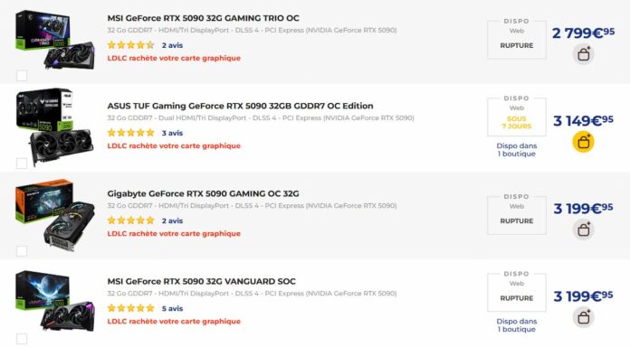 Les prix des cartes graphiques commencent aussi à augmenter et dans le lot, la RTX 5090 n’échappe pas à ce phénomène. Effectivement, nous sommes passés d’une situation où ce modèle était proche de son MSRP à une situation où les prix pratiqués sont bien plus élevés. D’autre part, nous constatons une rupture généralisée des stocks chez LDLC !
