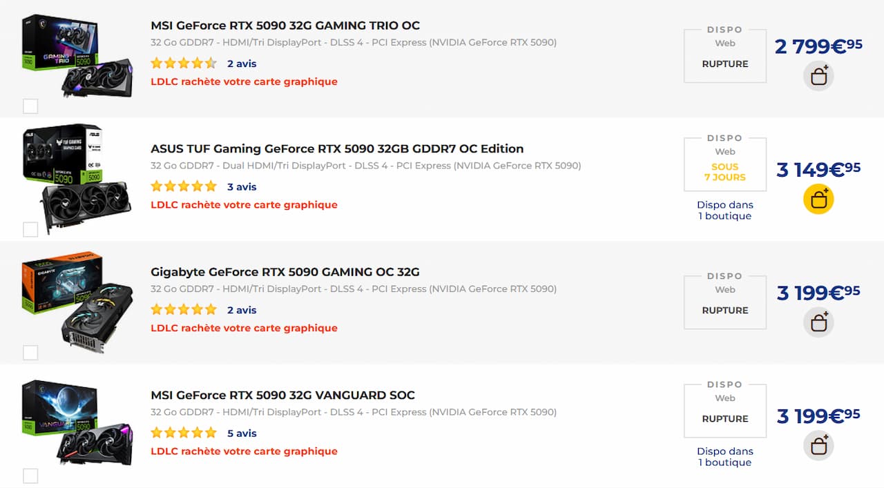 Difficile de tenir un discours optimiste par les temps qui courent. Entre la RAM dont les prix pointent en direction de la lune et ceux de la 5090 en plus de stocks vidés, nous vivons une période difficile. Eh oui, le prix officiel de la carte est de 2099 € si l’on se réfère à la fiche sur le site du caméléon. Or, dans les boutiques du groupe LDLC, le prix le plus bas est de 2799 € pour un modèle Gaming Trio OC de chez MSI… 700 € de plus que le prix officiel du caméléon. Mais plus inquiétant encore : la disponibilité, inexistante sur l’ensemble des trois boutiques du groupe LDLC : materiel.net, Top Achat et LDLC.