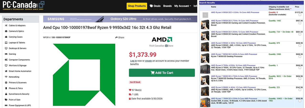 Le 26 mars dernier, AMD annonçait son nouveau processeur, le Ryzen 9 9950X3D2. C’est un modèle qui était attendu initialement au CES, mais dont le lancement ne s’est finalement pas fait. En attendant, bien que le CPU ait été annoncé par les rouges, les prix officiels restent encore secrets. Toutefois, deux revendeurs canadiens mettent en avant cette référence sur leur site dont le prix est d’environ US$990 une fois la conversion faite.