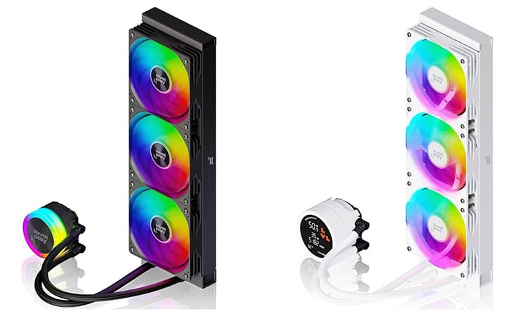 Avec ses nouveaux kits, la marque nous propose des AIO décliné en 360 mm dans le cas du modèle HUD, la version SE s’affiche quant à elle en 240 et 360 mm. Dans tous les cas, des déclinaisons noires et blanches sont proposées.