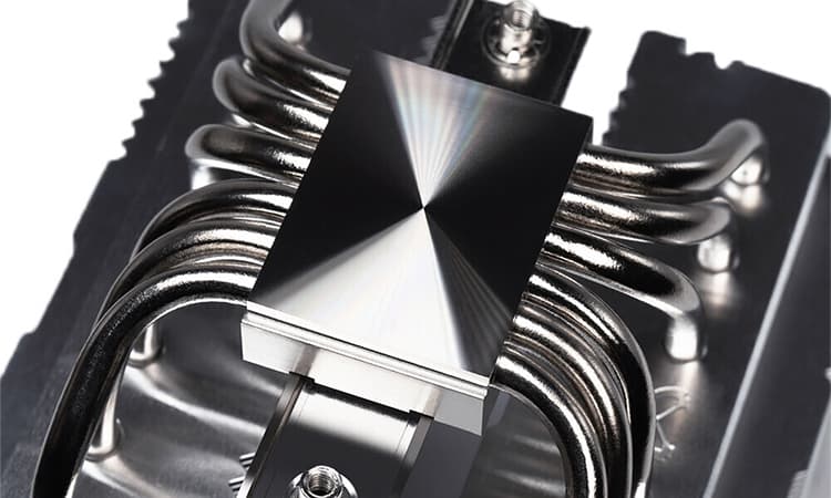 Le radiateur exploite donc une base en cuivre nickelée. Cette dernière, si elle n’est pas excentrée adopte une forme particulièrement allongée par rapport à d’autres références du marché. Pour maximiser la compatibilité avec la RAM, les premières ailettes sont raccourcies dans le bas. Le but étant de pouvoir monter de la RAM de 57 mm de hauteur en rehaussant le premier ventilateur.