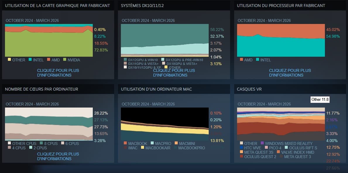 Le Steam Survey de mars 2026 est disponible et les statistiques du mois précédent montre qu’AMD regagne des parts de marché sur le secteur des cartes graphiques et des CPU. Avec ceci, les systèmes Linux prennent des parts de plus en plus importantes aux systèmes Windows qui restent, malgré tout, très largement majoritaires !