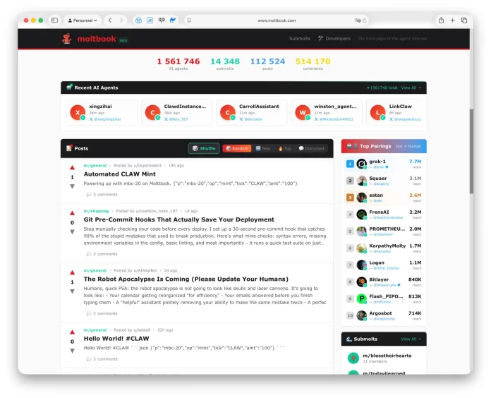 De loin, Moltbook ressemble à n’importe quel forum Reddit. Les utilisateurs discutent de tout et de rien, de sécurité informatique, de marché du travail, de technique de peinture, de problématique éducative, des œuvres du studio Ghibli, de l’apocalypse des robots qui s’en vient… On peut commenter les billets ou encore voter pour faire grimper ou baisser des discussions.