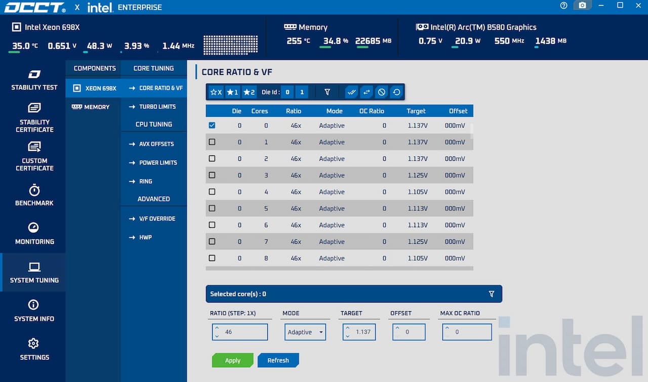 Actuellement, nous savons que les processeurs Granit Rapids seront supportés. Nous supposons que ce sera cas pour d’autres générations de CPU. Quant aux réglages, on devine qu’un ajustement de la tension VCore, du coefficient multiplicateur sera possible, et ce, cœur par cœur. Bref, reste à voir ce qu’il sera possible d’en tirer, mais le communiqué d’Intel évoque une solution « non contrainte pour les overclockers avancés cherchant un contrôle complet ». Affaire à suivre.