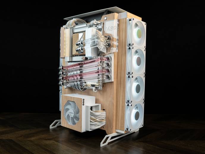 S’il est une carte mère qui représente précisément cette volonté de mêler esthétique et performance, c’est bien la Gigabyte X870E AERO WOOD. Il fallait un build à la hauteur de ses ambitions. Gigabyte a donc fait appel à Sarah Carlos, de Snaxan Studio, pour une pièce de showcase ultime sur châssis ouvert.
