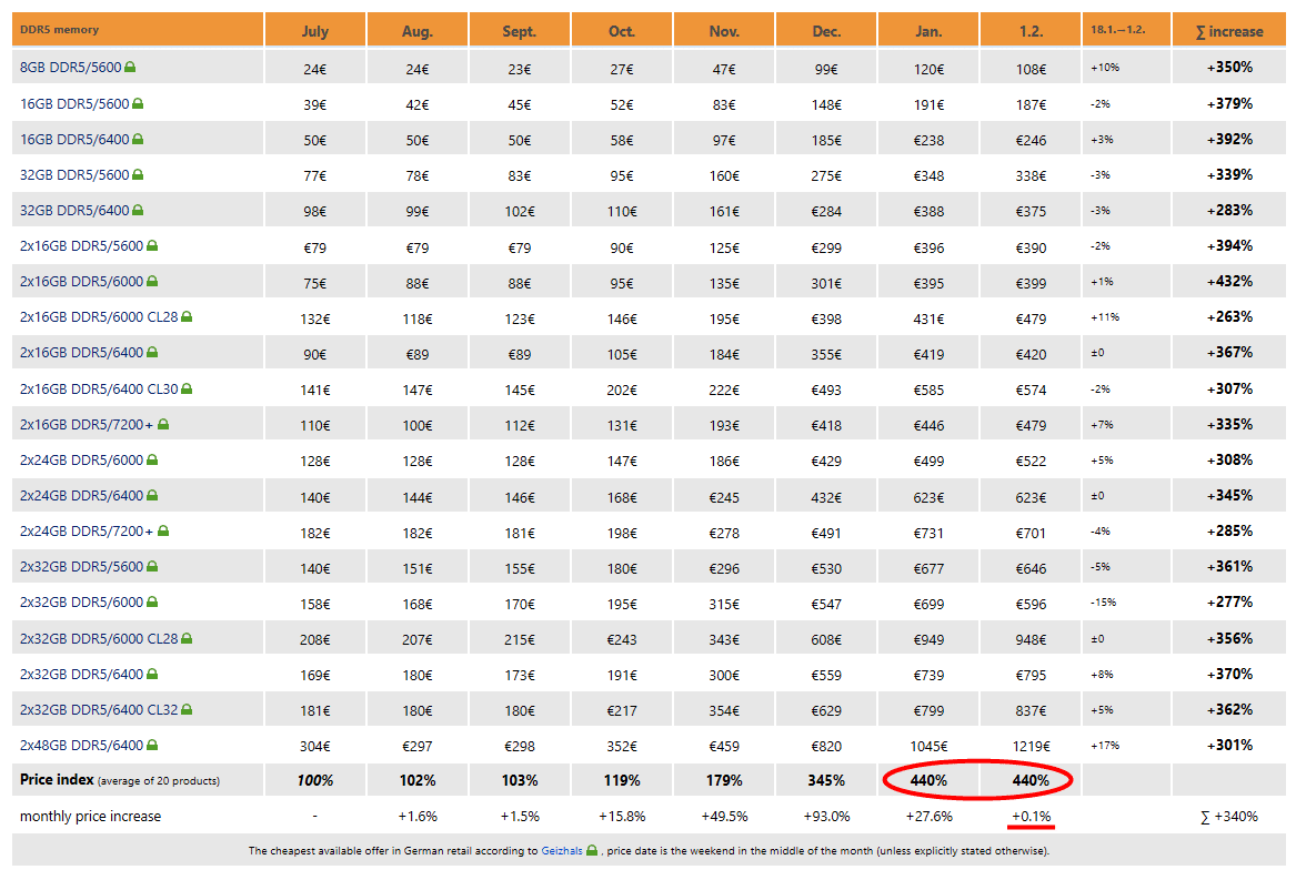 En Allemagne, la hausse des prix de la RAM semble marquer une petite pause. Effectivement, si l’on compare les prix actuels à ce qu’ils étaient à la mi-janvier, ils sont restés stables selon les constatations d’un confrère. Attention cependant, cela ne signifie pas que l’on commence à entrevoir la lumière au bout du tunnel, on vous explique pourquoi.