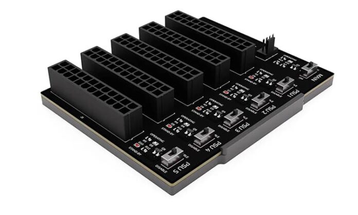 Dans les grandes lignes, il s’agit d’un circuit imprimé constitué de cinq connecteurs ATX 24 broches. Lorsque l’alimentation principale est mise sous tension, elle va faire démarrer les autres (jusqu’à cinq blocs). Bien sûr, suivant les besoins, on peut ne pas avoir besoin de faire fonctionner tous les blocs, c’est la raison pour laquelle des commutateurs sont présents pour couper les alimentations inutiles.