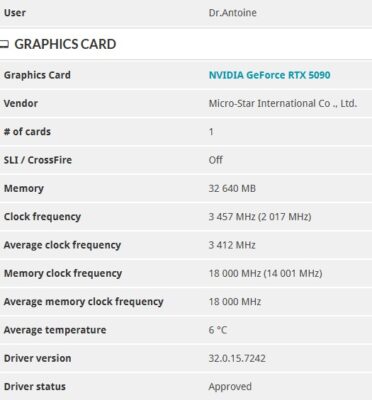Ensuite, toujours hier, nous avons eu droit à un record sur 3DMark Time Spy par le français Cmaker / DrAntoine. La marque affichée sur la 5090 utilisée pour ce record? MSI.