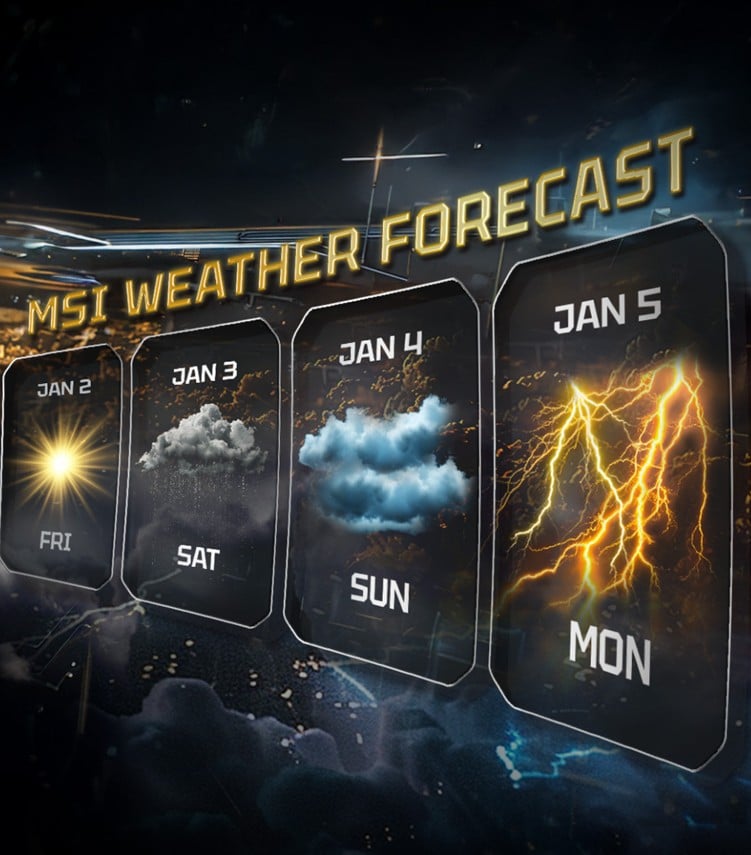 Premier indice, c’est ce post hier sur l’instagram de msigaming. On y voit donc un “bulletin météo”… qui annonce des éclairs (lightning en anglais) pour lundi. On en déduit une annonce pour cette rtx 5090 lightning au CES ce lundi?