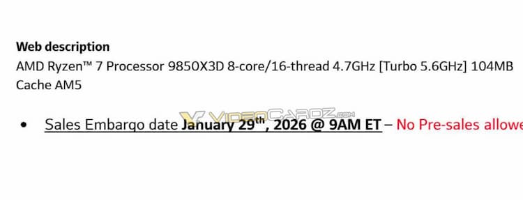 Du côté d’AMD, il y a eu une fuite, partagée par VideoCardz, concernant la levée de l’embargo pour le Ryzen 7 9850X3D. Ainsi, le 29 janvier 2026 à 15h, les rédactions seront autorisées à publier leurs papiers concernant ce processeur. Pour rappel, avec ce modèle, les rouges préparent une version « overclockée d’usine » du Ryzen 7 9800X3D, pour faire simple.
