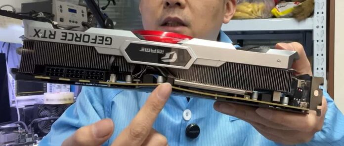 Une histoire qui se termine pour ce GPU puisqu’il a été victime… D’une violence conjugale, dirons nous. Effectivement, lors d’une dispute avec la petite amie de son propriétaire, cette RTX 3080 Ti iGame Advanced a servi de défouloir. Littéralement. Eh oui, la petite amie a frappé à plusieurs reprises la carte et le PC a fini par se couper. Le propriétaire emmène la carte chez un technicien et la fait réparer !
