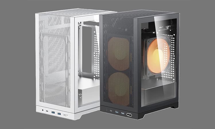 En interne, on aura de la place pour des composants de taille réduite. On parle d’une carte mère au format mini-ITX (17×17 cm). L’alimentation s’installe dans le bas, sous un cache, et devra adopter un format SFX ou SFX-L. Enfin, du côté de la carte graphique, cette dernière sera limitée à 20,5 mm de longueur (de quoi accueillir une RTX 5070 iGame Mini), le tout sur deux slots. Du côté du ventirad CPU, il n’y a que 135 mm de libres en hauteur.