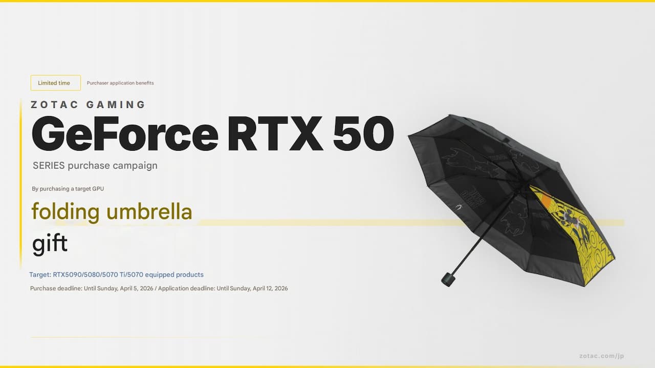 En ce début de matinée, l’actu est assez plate… Du moins, suffisamment pour que l’on traite des offres promotionnelles de Zotac au Japon. En effet, pour l’achat d’une carte graphique de bureau éligible, la marque vous offre… Un parapluie ! Un cadeau qui peut sembler anecdotique, mais pour y avoir été l’été dernier, croyez-moi, c’est utile en tout temps !