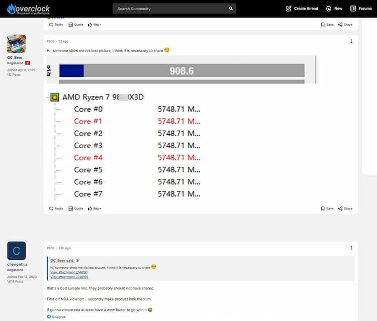 Sur le forum Overclock.net, dans une discussion à destination de la X870 Aorus Tachyon de Gigabyte, le membre OC_Beer partage une capture d’écran d’un Ryzen 7 98xxX3D overclocké à 5,75 GHz sur tous ces cœurs. Évidemment, le nom complet du processeur a été masqué pour ne pas violer le NDA en cours. Si AMD tombe dessus, le clocker peut toujours se défendre, de manière bancale : « c’était un 9800X3D ». Mouais.