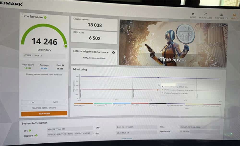 Néanmoins, l’opération s’est bien déroulée et la carte est correctement reconnue par le système. Ne reste plus qu’à booster sa consommation pour la pousser à 900W (300W d’origine). Dans ces conditions, la carte envoie du lourd sur 3DMark Time Spy avec un score graphique de 18 038 pts. À titre de comparaison, la carte fait mieux qu’un SLI de Titan RTX qui tape dans les 17 000 pts. La RTX 2080 Ti est clairement pulvérisée (12 000 à 13 000 pts) tandis que la carte vient se battre avec les RTX 3090 qui affichent dans les 18 000 à 19 000 pts.