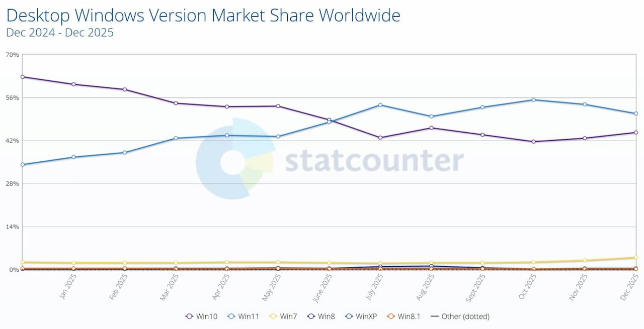 Certes, en juin 2025, Windows 11 devenait le système majoritaire de Microsoft avec un W10 dont les parts étaient en baisse d’août à octobre 2025. Mais depuis, le système regagne des parts, rien de fulgurant, mais l’écart se réduit entre l’ancienne et la génération actuelle de systèmes de Microsoft. Actuellement, d’après Statcounter, W11 est à 50.73% de parts de marché contre 44,68% pour W10. Si cette tendance et ce rythme se poursuivent, nous pourrions voir l’ancien système de Microsoft reprendre l’ascendant dans deux ou trois mois.